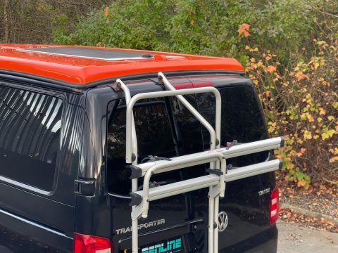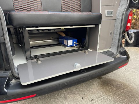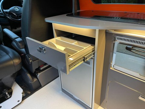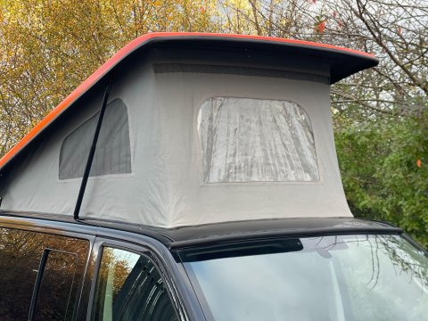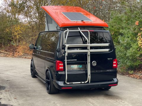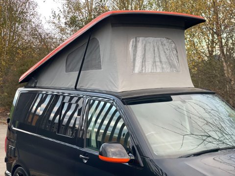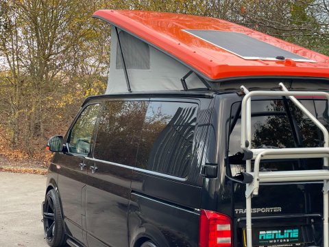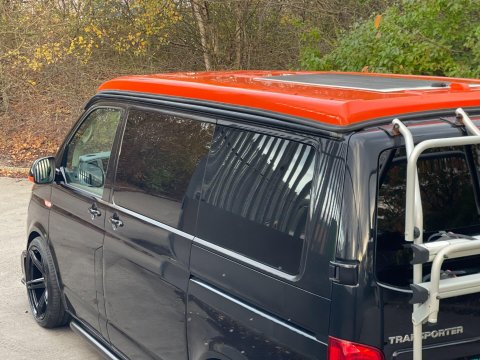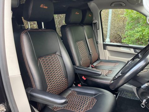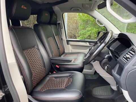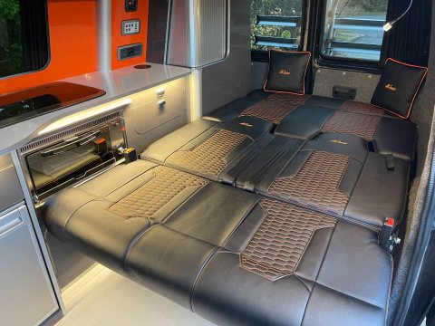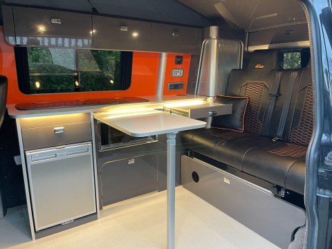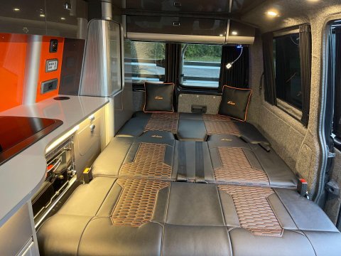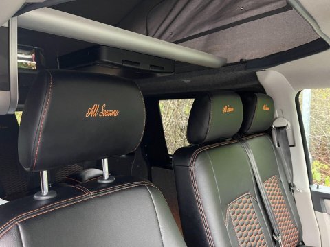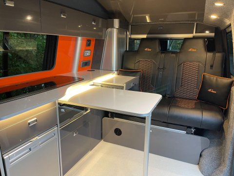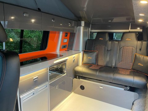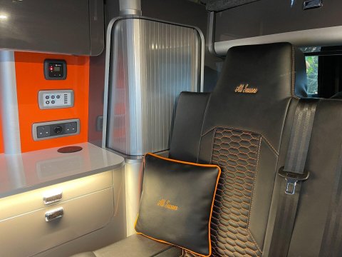 Available now we offer this beautiful All Seasons Bespoke Campervan. Rest assure a conversion done by this company is a high quality and professional build which comes with a 10 year warranty package. This is a 4 birth van 2 in the pop top and 2 on the tilt & slide bed with many extras such as; Double Swivel seat base, Bespoke Matching Upholstery, B2B Charging System with Solar Panel, Sargent System with Control Panel, Propex Night Heater, Dometic Sink & Gas Hob, Dometic Fridge Freezer, Dometic Grill, Flip Down TV with Wireless Headphones, Reima Awning Rail, Blackout Curtains, Side Filled Water Tank, 240v Hookup, Gas Bottle Locker, Fold Out Matching Table, LED Strip Lights, Spot Lights & Reading Lights, Wireless Charging Point, Fully Insulated & Carpeted, Altro Flooring, with exterior finishes like Full Gloss Black Package with orange details, Lowered Suspension, 20" RIVIERA Wheels, Sportline Front Added Splitter, Fiamma Carry-Bike Rack, Side Bars & Bumper Protector to list a few!